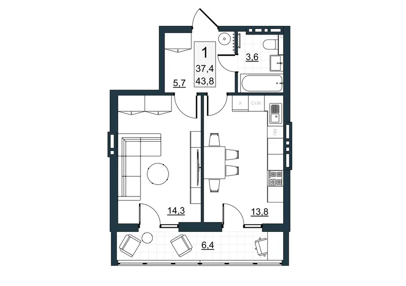 | Общая площадь | 37.4 м² |