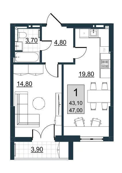 | Общая площадь | 43.1 м² |
