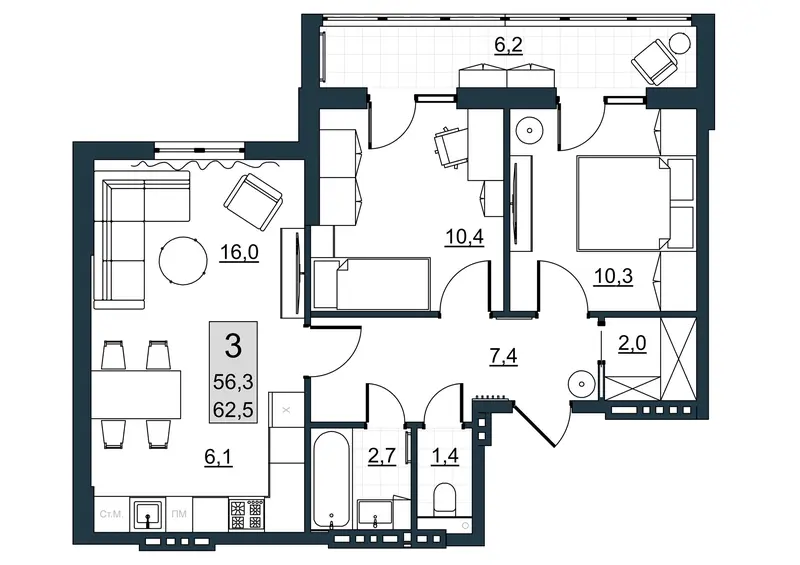 | Общая площадь | 56.3 м² |