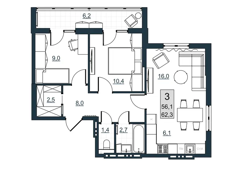 | Общая площадь | 56.1 м² |