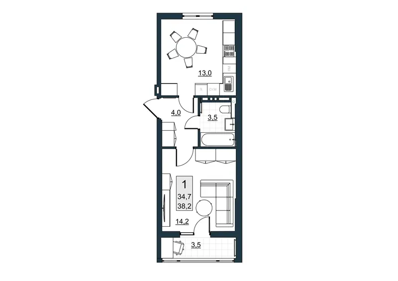 | Общая площадь | 34.7 м² |