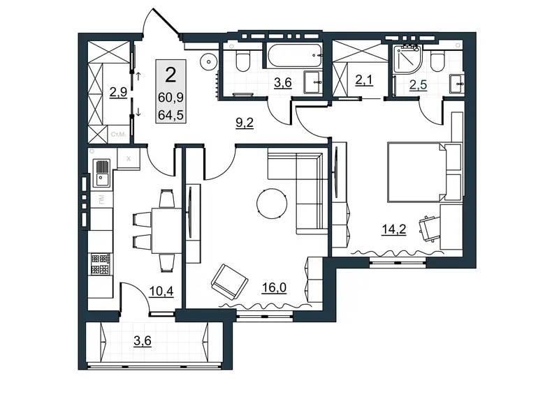 | Общая площадь | 60.9 м² |