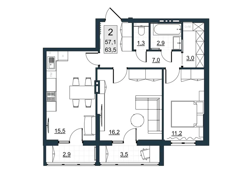 | Общая площадь | 57.1 м² |